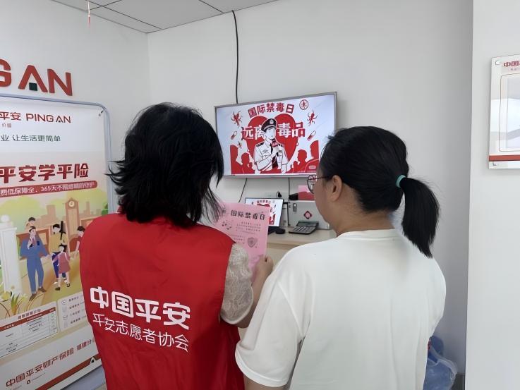 平安产险福州中心支公司及下辖机构在职场设立宣传点,悬挂禁毒标语。工作人员向上门客户发放通俗易懂的禁毒知识手册、宣传单页,并结合真实案例,耐心讲解毒品对个人、家庭和社会的巨大危害,特别是新型毒品的伪装性与迷惑性,提醒居民提高警惕,鼓励举报涉毒线索,共同守护无毒和谐的社区环境。
