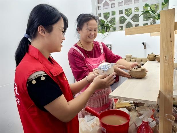志愿者们围拢过来,指尖轻触瓷面细腻的纹路,听阿姨慢慢讲述每件作品背后的故事——有年轻时跟着师傅学拉坯,因力道不足摔碎瓷坯的遗憾;有改革开放后,带着手工瓷花去市集售卖,被顾客夸赞“比机器做的有灵气”的骄傲;还有坚守工作室几十年,看着身边同行陆续转行,却始终舍不得放下手中瓷泥的执着。“陶瓷就像我的老伙计,陪着我走过苦日子,也给我带来好多欢喜。”阿姨的话语朴实,却让在场志愿者深受触动。