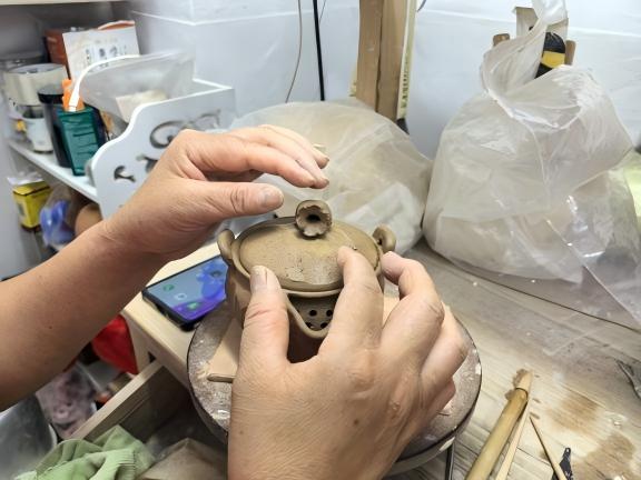 工作室充满了浓厚的艺术氛围,架子摆满的精美陶瓷手工制品见证着主人的非凡技艺。工作桌上摆放着揉泥板、修坯刀等工具,陈阿姨正专注地捏制瓷花,指尖翻飞间,一片栩栩如生的牡丹花瓣逐渐成型。看到志愿者们举着相机记录,陈阿姨笑着拿出手机向志愿者展示她之前的陶瓷作品:“这是我二十多岁做的‘缠枝莲纹茶杯’,那时候手劲没现在稳,烧了三次才成;这个小瓷兔,是给我孙辈捏的,现在他都当爸爸咯。”