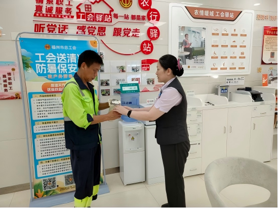 农行鼓屏支行立足工会驿站,为网点周边环卫工人送上解暑物资与贴心关怀;农行福清支行打造“爱心歇脚点”,环卫工人等户外劳动者可随时进入,工作人员主动递上热水,提供休息等服务,用一杯水、一份爱心传递关怀;农行东大支行在网点门口设立“爱心茶摊”,为奔波忙碌的快递员等户外工作者送上夏日清凉......“平时送件顾不上喝水,这儿的茶摊就像个‘加油站’,喝一口浑身都舒服!”一位刚接过热茶的快递员感慨道。