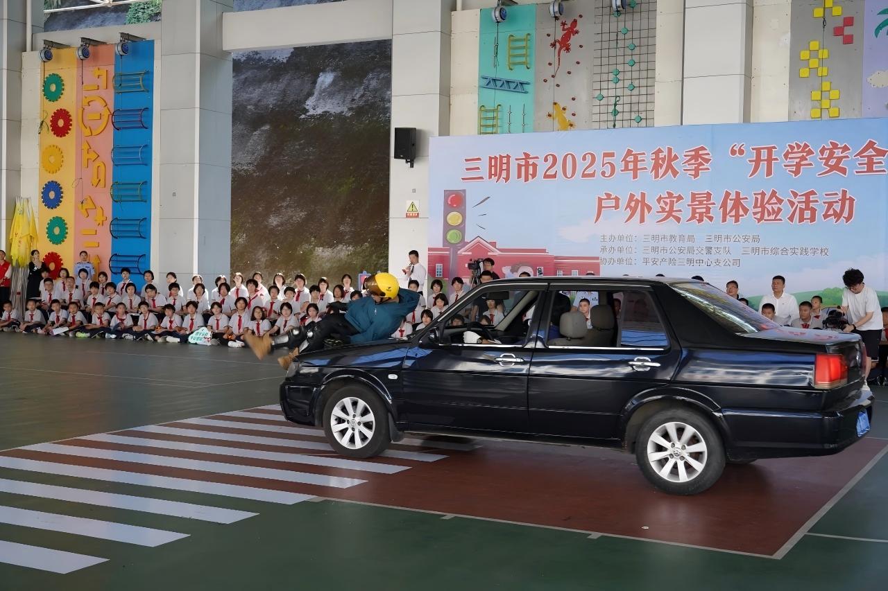 8月26日上午,三明市综合实践学校迎来了一场别开生面的“开学安全第一课”——户外实景体验活动。由三明市公安局联合三明市教育局共同主办、平安产险三明中心支公司协办的本次活动,特别邀请了专业特技演绎团队,为学生们带来了一场震撼人心的交通安全教育。