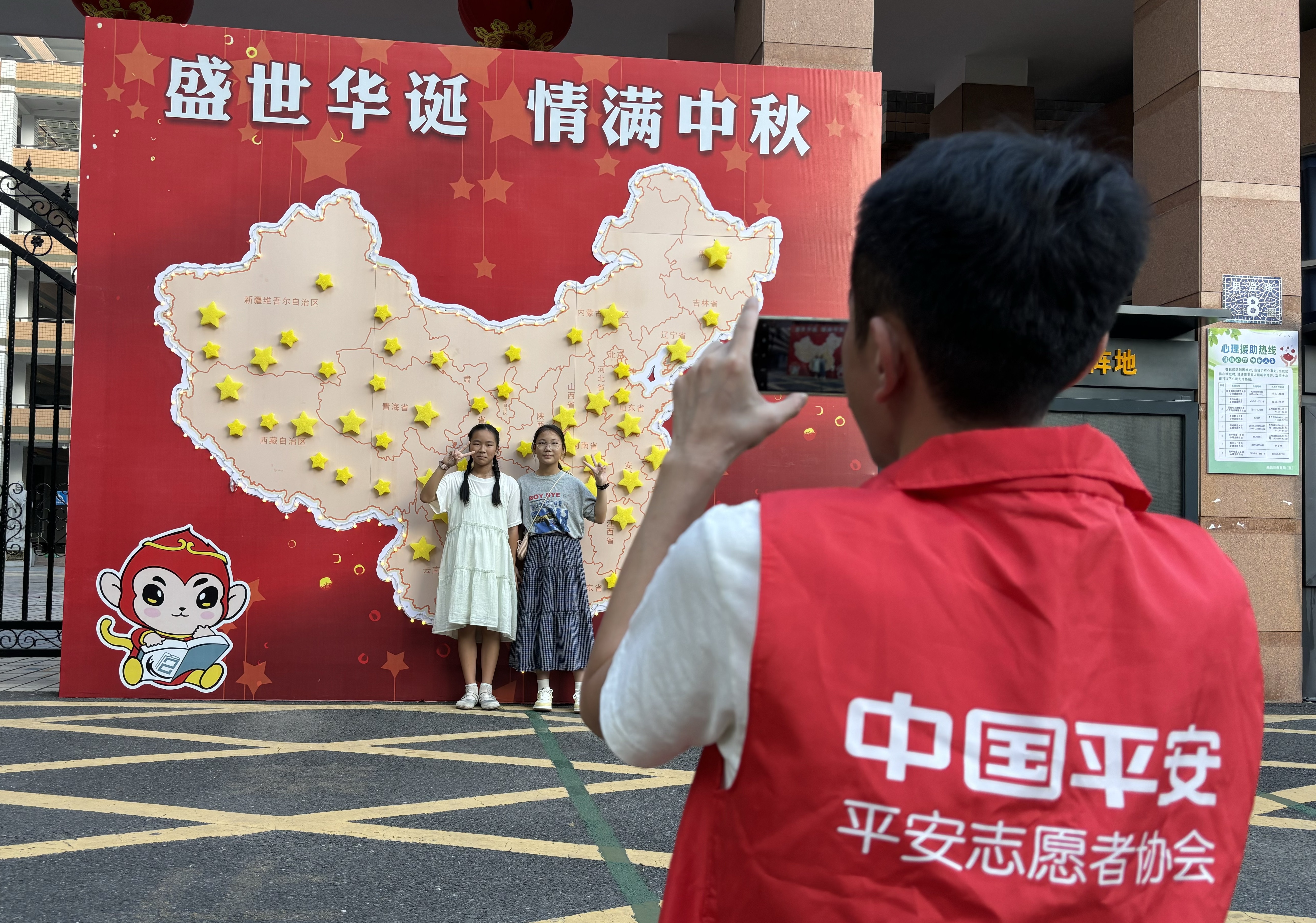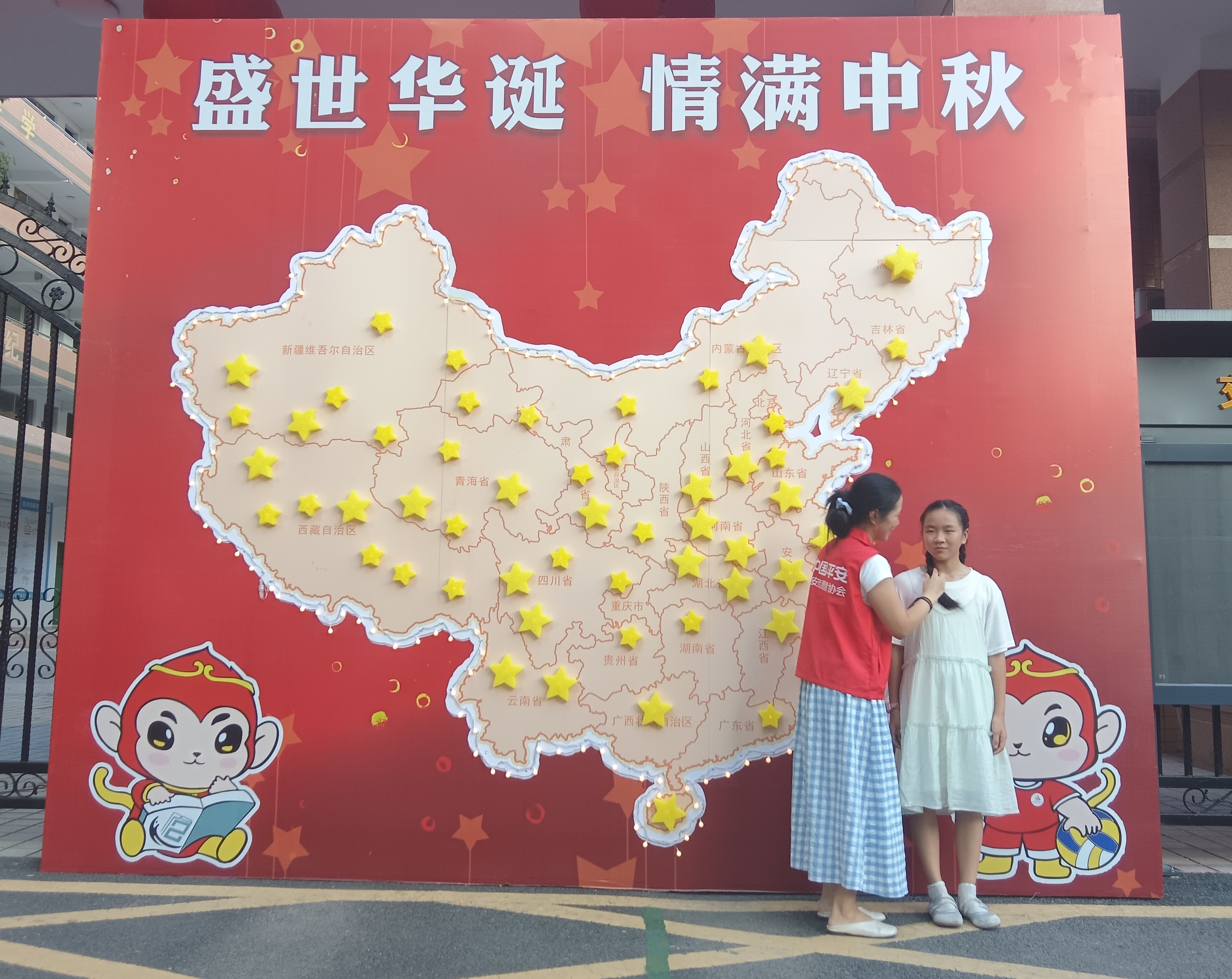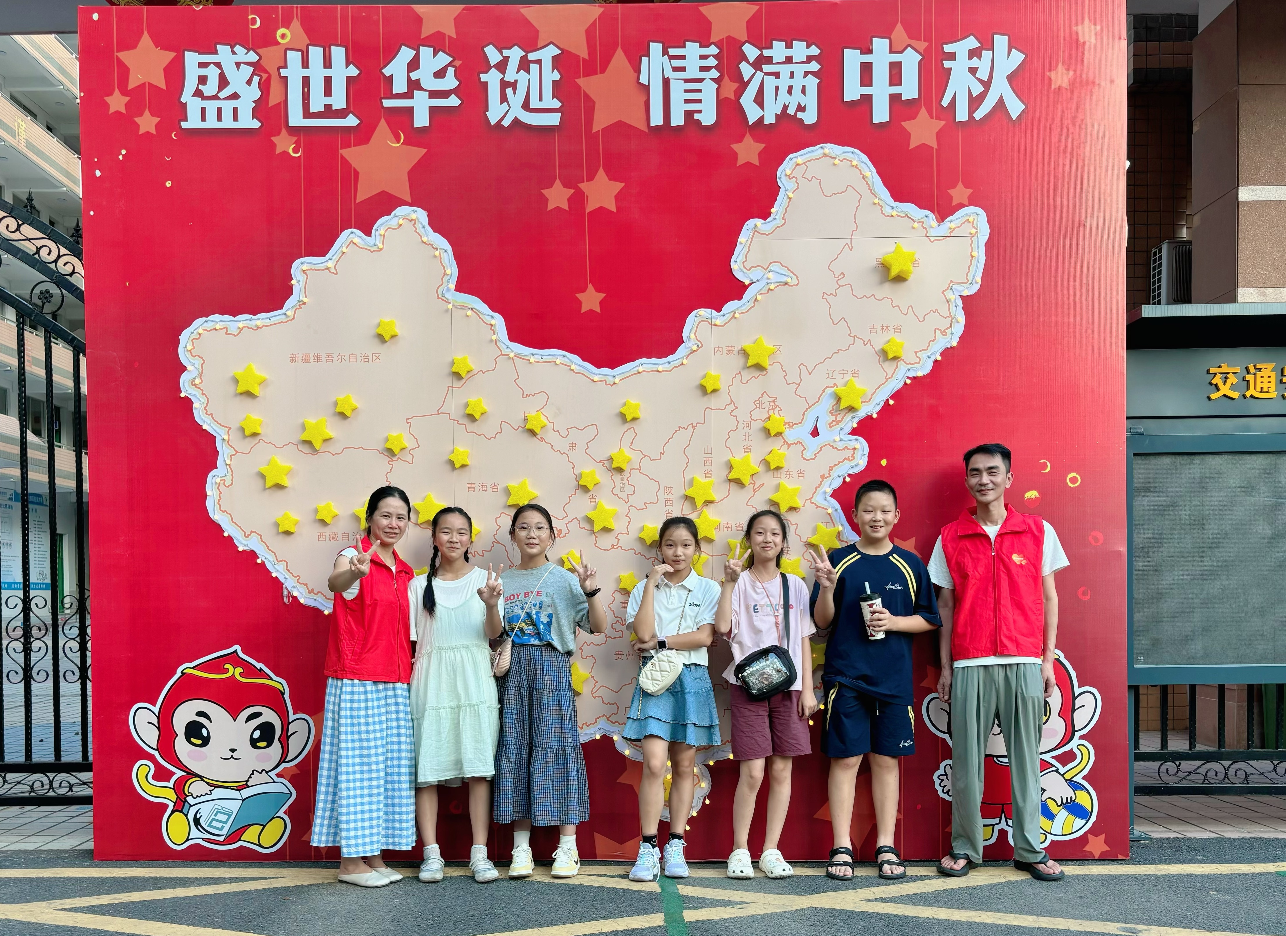 当天的活动现场暖意融融,志愿者们化身临时“家人”,时而细心帮孩子整理衣领,时而用幽默的话语逗得孩子们开怀大笑。“你的笑容比国旗还鲜艳!”在志愿者的鼓励下,原本害羞的孩子们逐渐放松,以敬礼、比心、搞怪等各种POSE,在祖国地图前留下最精神的模样。这个临时搭建的“移动摄影棚”,成为假期校园门口最温暖的一道风景。