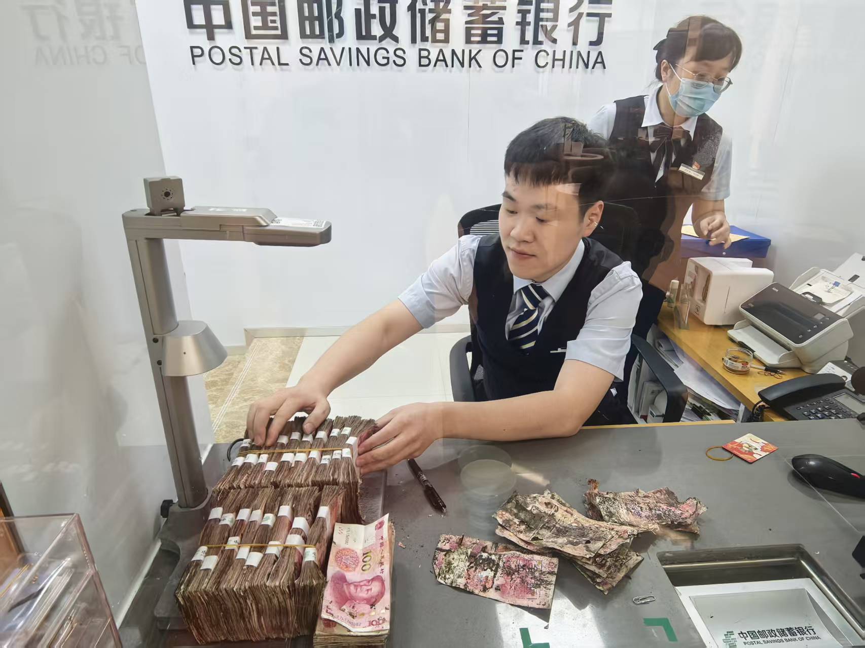 国庆长假后的第二天,客户许先生携带着因保存不善而严重受潮、粘连、虫啃的18万元现金,忐忑不安地走进邮储银行莆田市城厢区支行,想要存入账户。大堂经理热情迎接客户,当客户将业务诉求与这些残损币递给大堂经理时,厅堂工作人员没有丝毫排斥,热情地为客户取号,并上报网点负责人,考虑到金额较大,清点困难,支行立即安排绿色窗口为客户办理。