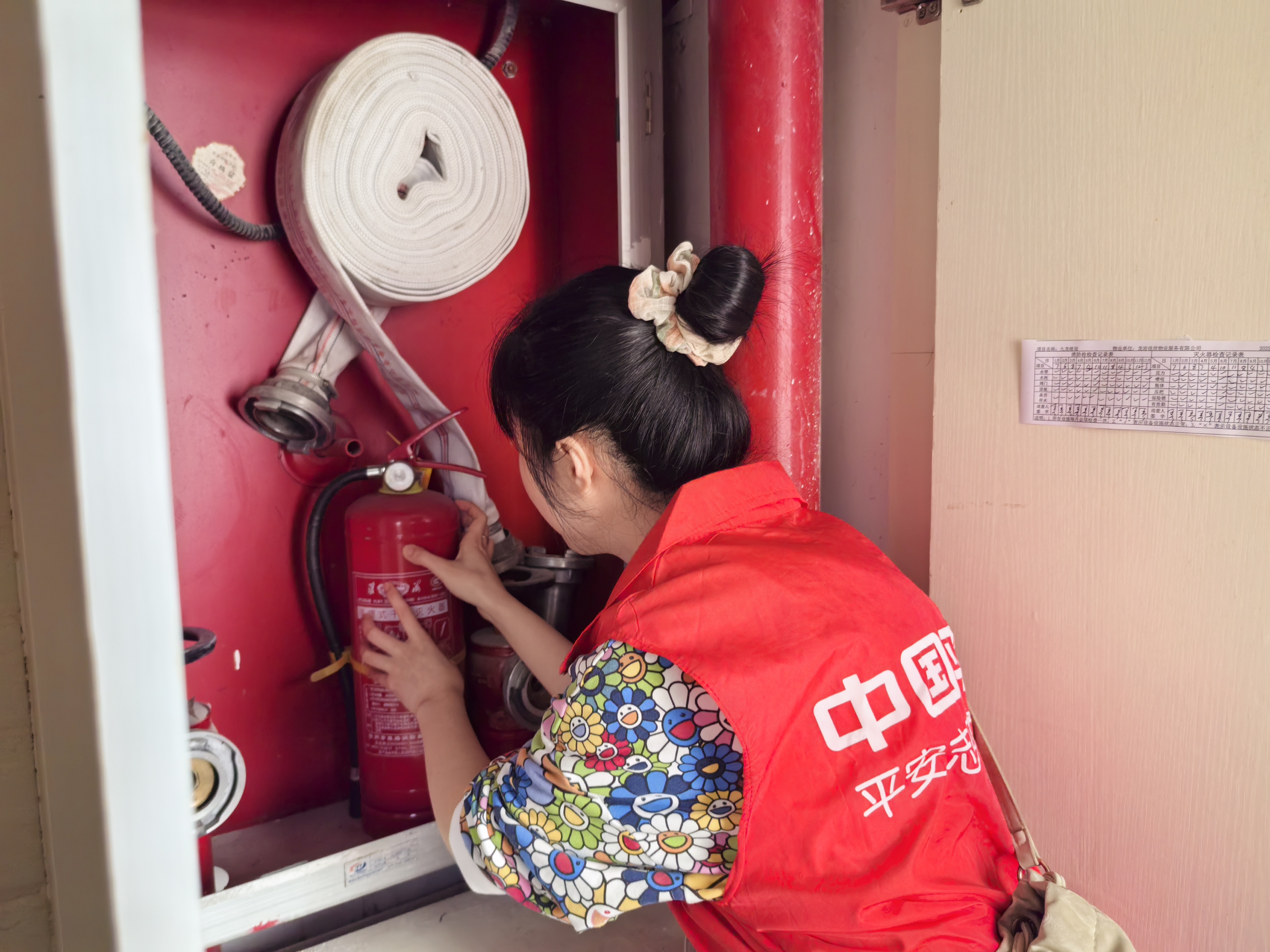 与此同时,漳平市九龙桂冠小区的楼道里,另一群“平安守护者”正俯身检查消防栓。平安产险龙岩中心支公司漳平营销服务部联动城南社区党委、漳平市倡导生态环保志愿者协会,共同清理堆满杂物的消防通道,记录消防隐患,并第一时间反馈物业整改。平安产险志愿者一边细致检查灭火器的压力值,一边向居民解释:“消防设施畅通,也是守住家门的重要防线。”