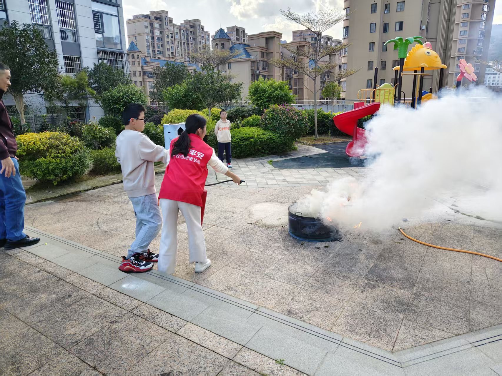 理论知识刚“充电”完毕,一场突如其来的“火灾”打破了午后的宁静——别担心,这是平安产险闽清支公司志愿者们精心策划的消防安全实战演练。