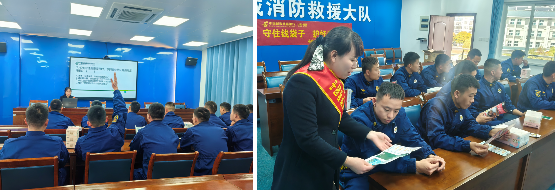 近日,邮储银行连城县支行邮爱驿站服务小分队走进连城救援消防大队,以“守住钱袋子,护好幸福家”为主题开展定制化金融知识宣讲,为守护人民生命财产安全的“逆行者”送上专属金融安全防护指南。