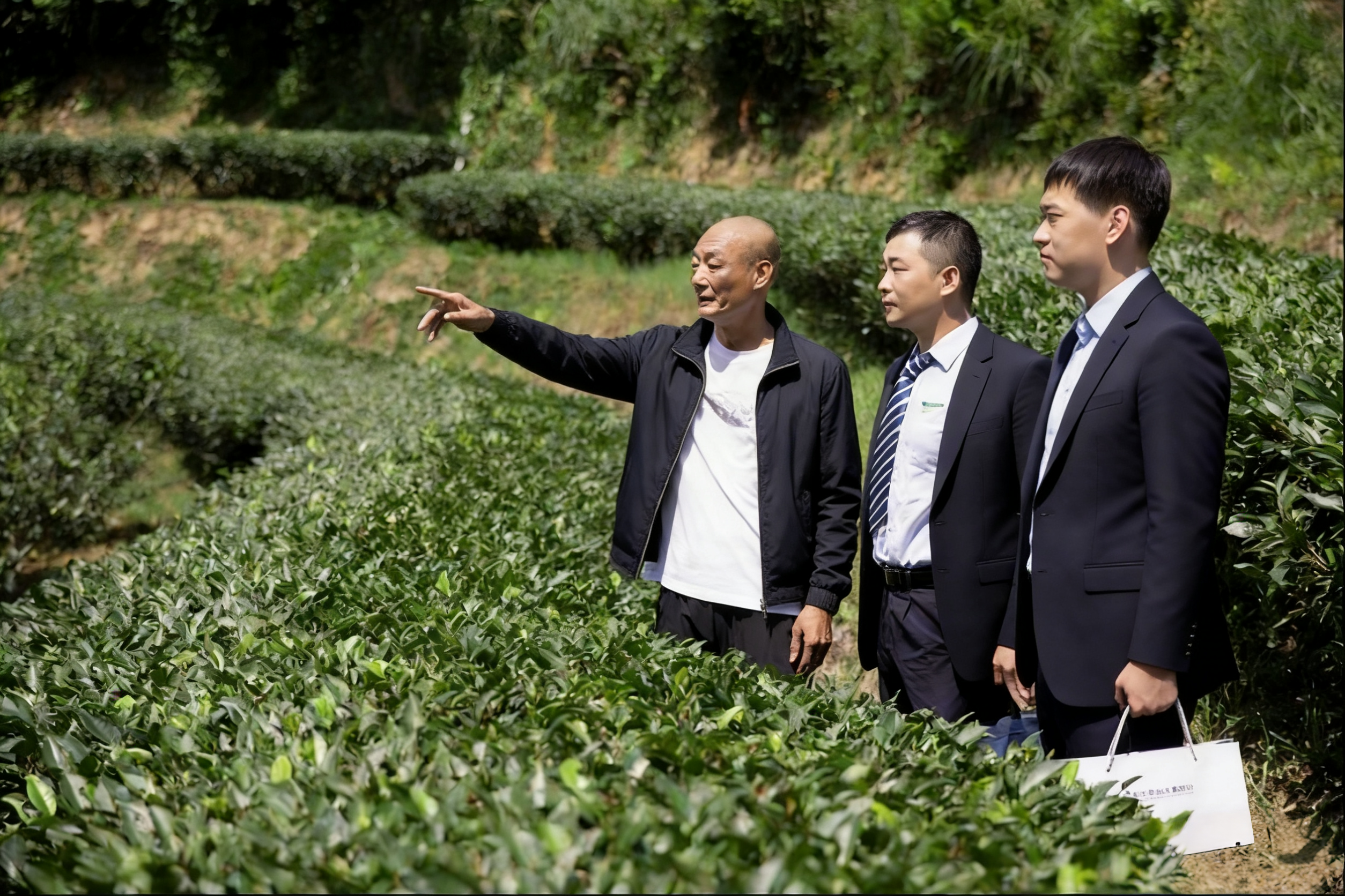 邮储银行龙岩市分行工作人员(右一、右二)到茶山调研。机构/供图