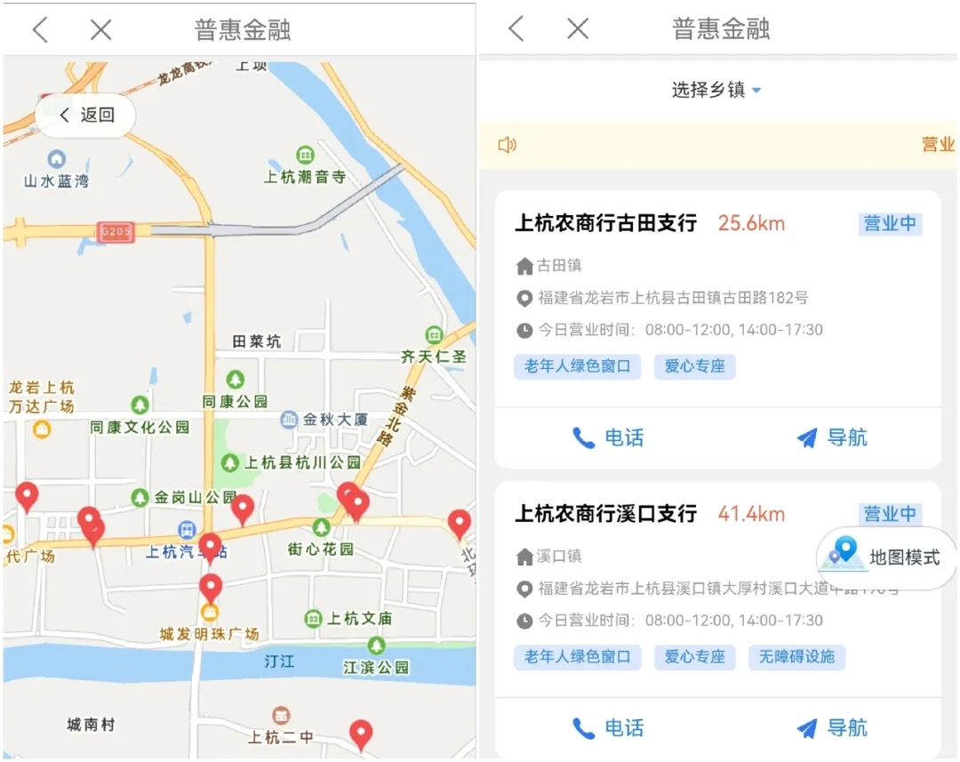 “e龙岩”app“支付适老网点导航(上杭)”板块页面
