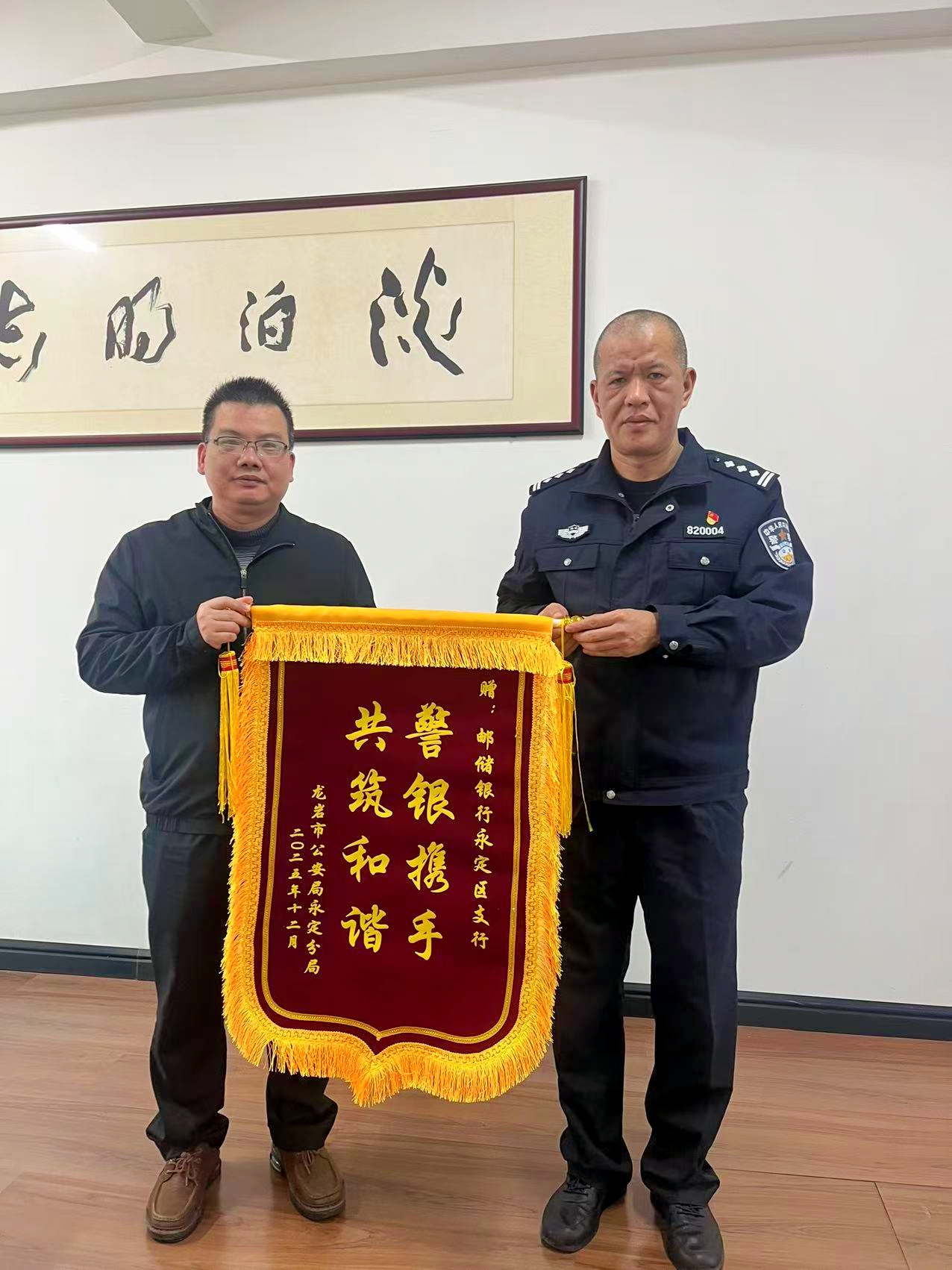 近日,一面承载着深厚情谊的锦旗在警银之间传递——龙岩市公安局永定分局向邮储银行永定区支行赠送“警银携手 共筑平安”锦旗,以此感谢支行在深化警银协作、筑牢金融安全防线中的突出贡献。金色盾牌与绿色金融的又一次握手,见证着双方携手同行、共护民安的坚实足迹。