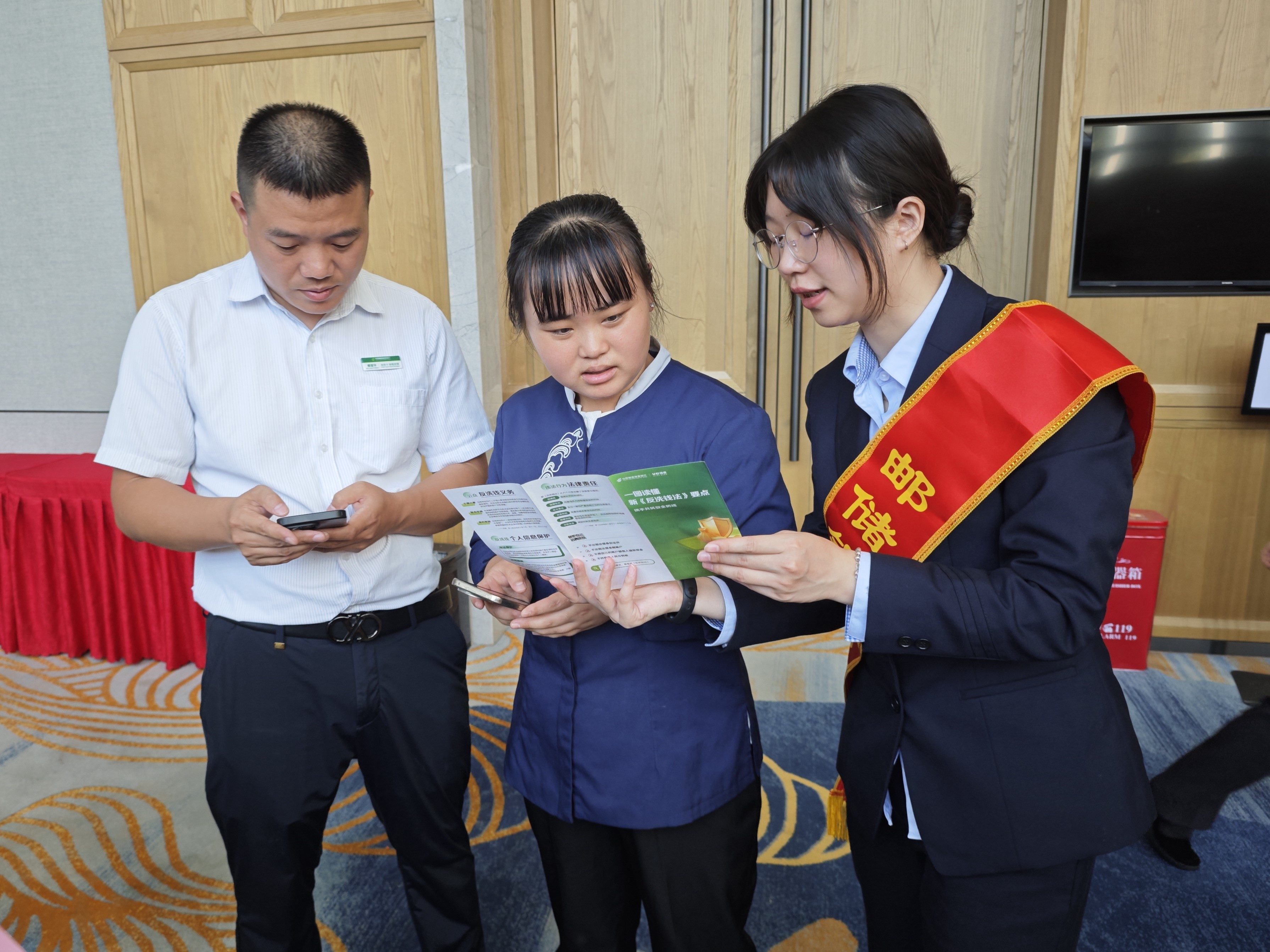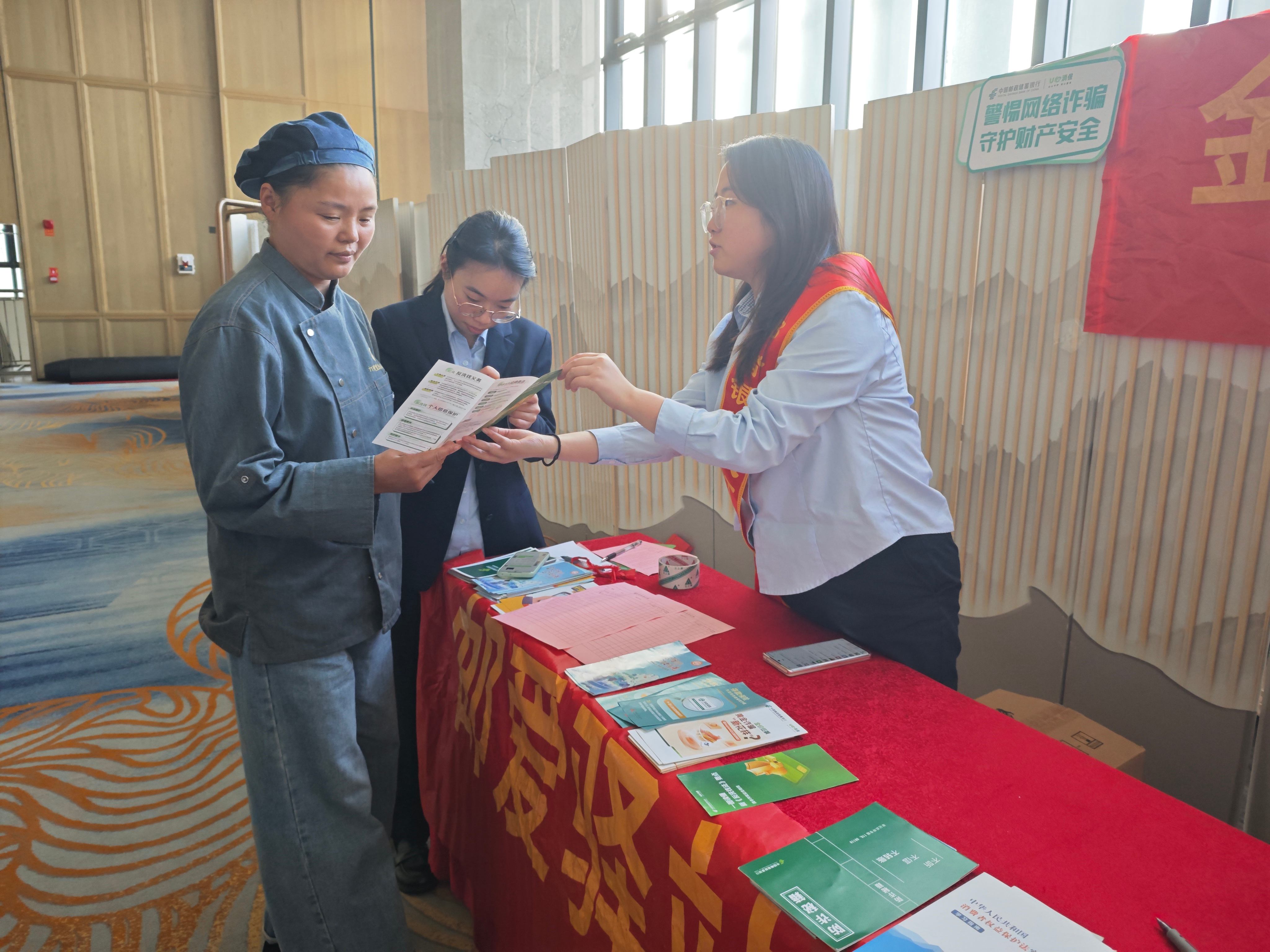 活动现场,支行精心部署、多维发力,通过“定点宣传+主题宣讲”双模式,确保宣传入脑入心、取得实效。在酒店会议室门口,宣传服务点整齐有序摆放,小分队成员化身“金融宣传员”,主动向前来参会及过往的酒店工作人员发放金融知识折页,以通俗易懂的语言、真实典型的案例,面对面、一对一开展宣讲,重点普及防范电信网络诈骗、反洗钱等核心知识,细致拆解“刷单诈骗”“冒充公检法诈骗”“虚假网络贷款”等高频骗局的作案手法和识别技巧,反复叮嘱大家守住“钱袋子”,切实筑牢金融安全思想防线。