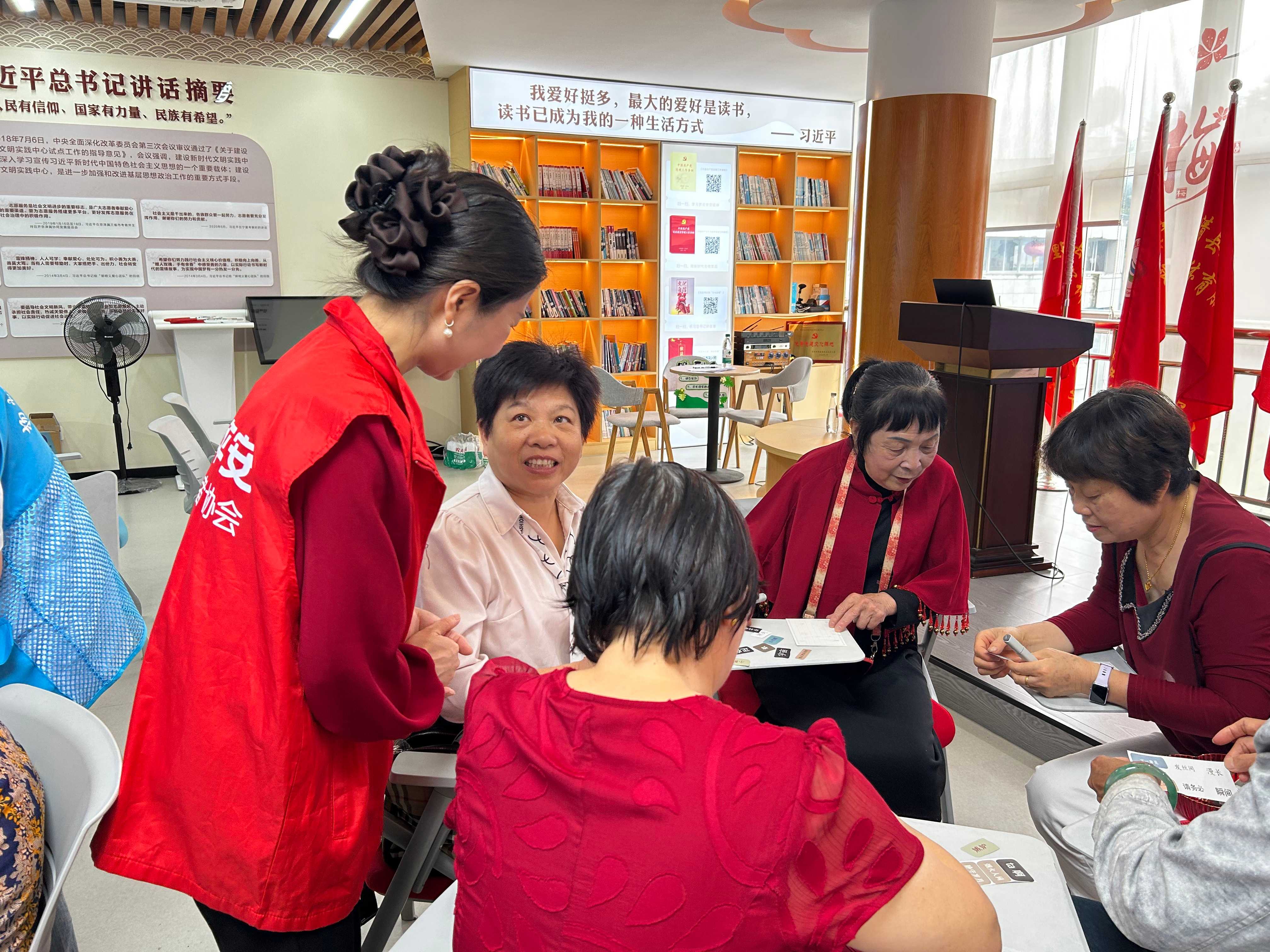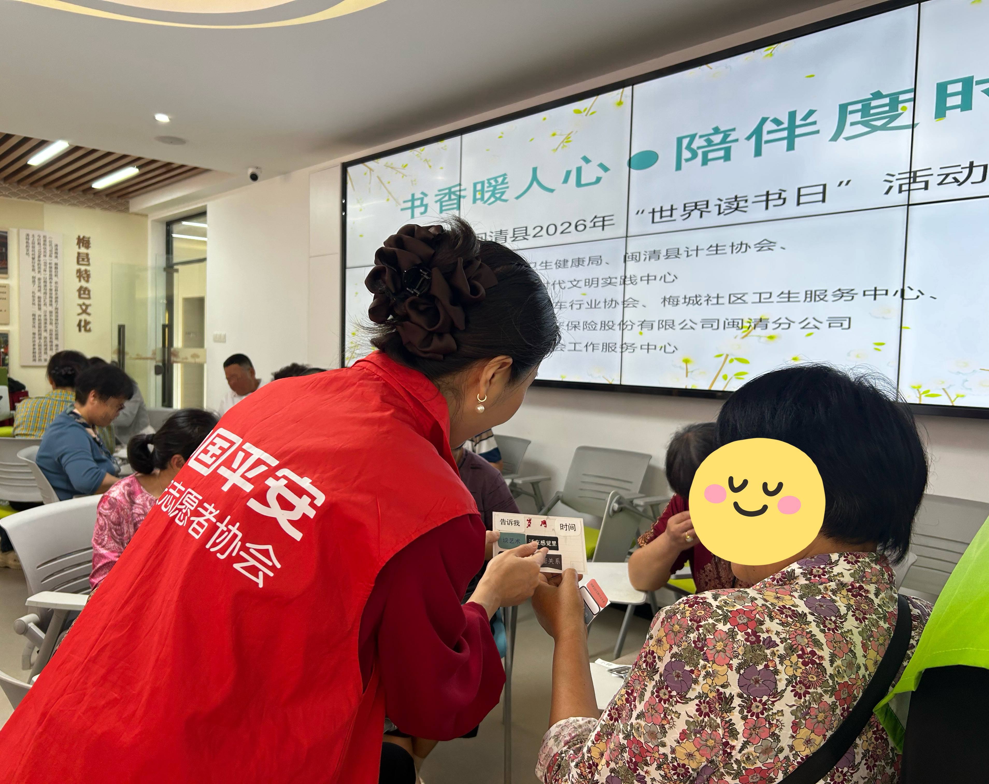 这是由闽清县卫健局、闽清县计生协会、闽清县新时代文明实践中心主办,平安产险闽清支公司协办的“书香暖人心·陪伴度时光”世界读书日主题活动。25位来自特殊家庭的孤寡老人受邀参加,平安产险志愿者早早来到现场布置,从桌椅摆放到卡片裁剪,每一个细节都透着用心。